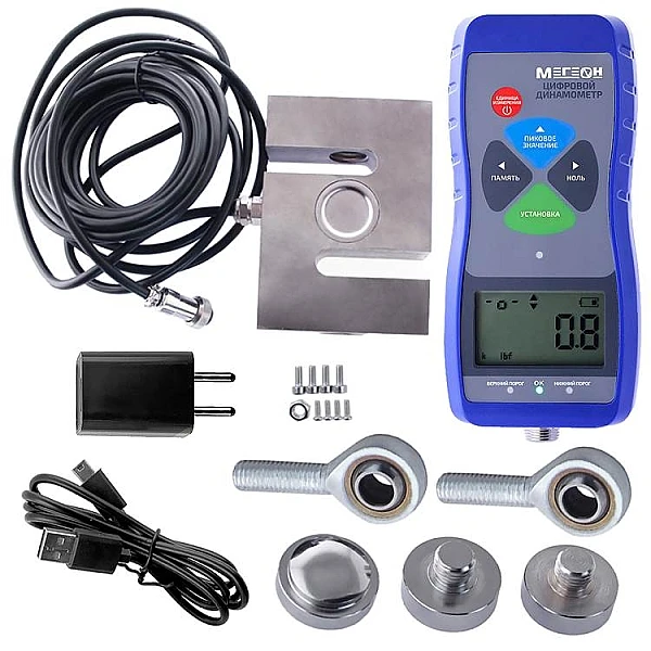 Компактное устройство МЕГЕОН 53005К с выносным тензодатчиком предназначено для измерения силы на сжатие-растяжение, проведения замеров усилия вставки и разъединения, для разрушающих испытаний в лабораторных и исследовательских центрах, а также на производстве и в промышленности. В приборе присутствуют функции фиксации пиковых показаний, а также вычисления максимальных, минимальных и средних значений. Выбрать измерительные единицы из трёх имеющихся можно с помощью соответствующей клавиши. Модель обладает внутренней памятью, объёмом 999 ячеек. Прибор используется в испытании различных изделий на растяжение-сжатие, измерения усилия вставки и разъединения, испытаниях на разрушение и т.д.