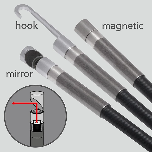 При необходимости на наконечнике зонда с гусиной шеей можно дополнительно закрепить зеркало под углом 45°, крючок или магнитное крепление, расширяющие функциональный диапазон устройства. Например, крепление зеркала под углом 45° позволяет "заглянуть за угол" или поближе рассмотреть объект с разных точек зрения. С помощью магнита или крепления на крючке вы можете удалять предметы, стоящие на пути, или извлекать их. Благодаря беспроводной работе, устройство отличается удобством в использовании. На дисплее отображается дата и время, а также точная документация о времени. Мини-видеоскоп BO22 поставляется в комплекте с удобной транспортной сумкой, включая все необходимое оборудование для немедленного использования. Пожалуйста, обратите внимание: для сохранения фотографий и видео вам потребуется карта microSD объемом памяти до 32 ГБ.
