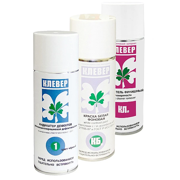 Набор расходных материалов для проведения магнитопорошковой дефектоскопии мокрым методом по ГОСТ Р 56612-2015, состоящий из очистителя поверхности, белого грунта и магнитного индикатора.