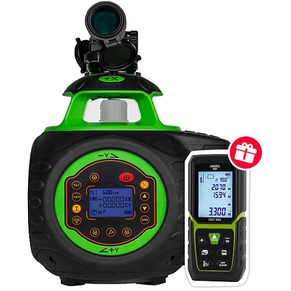 Пользователь ротационного нивелира AMO ROTOR 600G может установить наклон луча двумя способами - в ручном режиме (любой произвольный уклон) или, что гораздо более точно, при помощи кнопок, в диапазоне ±10%. Выбранные значения угла по двум осям отображаются на дисплее. В комплект входит специальная площадка с тонкой подстройкой угла наклона для установки на штатив.