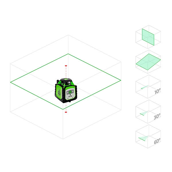 Главная особенность лазерного нивелира - лазерный луч зеленого цвета, более современное решение, чем аналоги с красными излучателями. Человеческий глаз гораздо лучше различает зеленые линии на большом расстоянии, при ярком искусственном или естественном освещении, что дает несколько дополнительных метров видимости при разметке без приемника. Лучше всего этот прибор подойдет тем, кто совмещает работу на открытых стройплощадках с отделкой помещений.