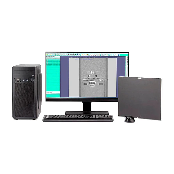 Корпус детектирующего блока выполнен из металла или прочного пластика и имеет карбоновое покрытие рабочей области. Питание панели предусмотрено от сети переменного тока, связь с компьютером осуществляется двумя UTP кабелями, которые обеспечивают высокую скорость передачи данных. Для преобразования рентгеновского излучения в аналоговый световой сигнал используются сцинтилляторы на основе оксисульфида гадолиния (Gadоx) или на основе соединения йодида цезия (CsI). Дальнейшее преобразование света в электроны производится матрицей, состоящей из полупроводникового материала – аморфного кремния (a-Si), и тонкоплёночных транзисторов (TFT), представляющих из себя полупроводниковые элементы, передающие электрический заряд на аналого-цифровой преобразователь. АЦП проводит измерение тока, полученного с транзистора, преобразовывая электрический сигнал в цифровой для последующей передачи информации на персональный компьютер оператора, разрядность аналого-цифрового преобразователя позволяет получать высококачественное изображение в диапазоне до 65 536 оттенков серого. Далее, с помощью специализированного программного обеспечения Стражник формируется файл защищенного расширения DICONDE, доступного для последующей обработки и анализа.